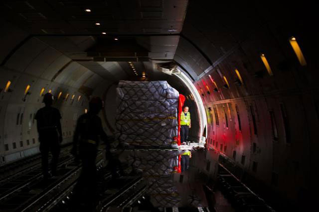 2018年5月18日,無錫機場工作人員正在對運往德國哈恩的貨物進行搬運。